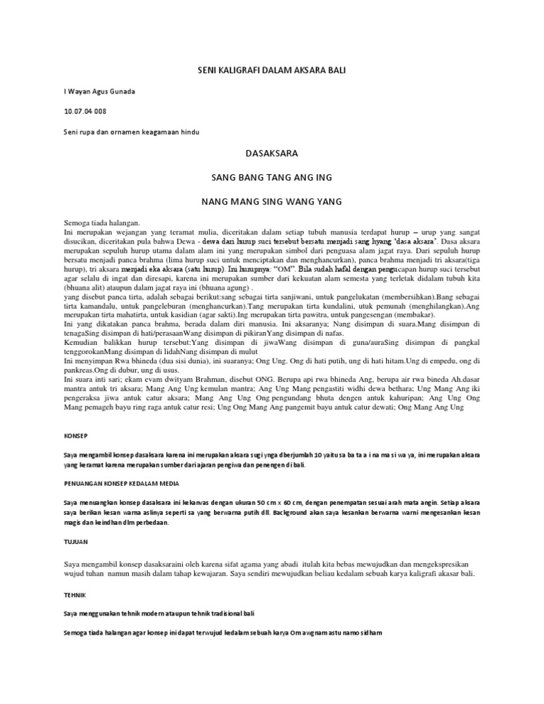Selama ini masih positiflah disamping bertujuan untuk pelestarian aksara bali itu sendiri tetapi juga pelestarian untuk nilai nilai yg ingin disampaikan melalui aksara kaligrafi itu begitu katanya. Kedua contoh kaligrafi tersebut mempunyai struktur dan fungsi yang khas. Aksara bali adalah aksara tradisional masyarakat bali dan berkembang di baliaksara bali merupakan suatu abugida yang berpangkal pada huruf pallawaaksara ini mirip dengan aksara jawaperbedaannya terletak pada lekukan bentuk huruf.
